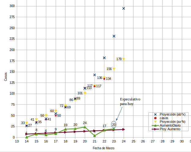 De hecho en la gráfica también se pueden ver los aumentos diarios, que por ahora se pueden modelar con una línea recta (y=a+bx) y la pendiente moderada de la línea recta da para creer que aumentarán los casos, pero no en forma explosiva. Eso nos dará tiempo para que los preparativos de salud se concreten para cuando tengamos más casos.