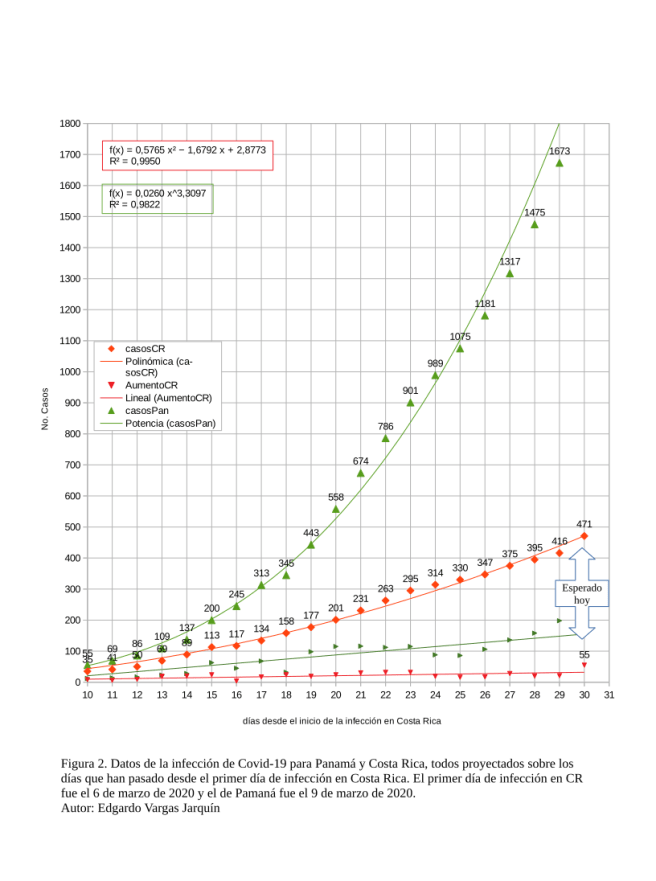 El problema es que el dato calculado con esta nueva función dice que podríamos tener 55 casos nuevos y que el total crecería hasta 471 casos. Por supuesto prefiero que esta proyección no sea correcta, pues nos mostraría que lo que viene anunciando el señor Ministro empieza a hacerse una realidad. La pandemía en Costa Rica podría pasar a la fase 4.