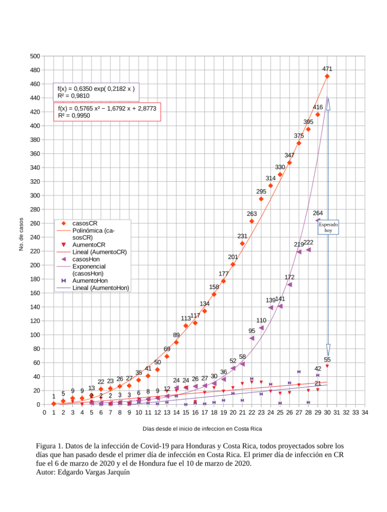 Las proyecciones de hoy, día 30 en la gráfica, las recalculé, sobre todo porque el modelo que había venido usando para Costa Rica no estaba ajustándose bien a los datos. Para esto efectos probé una función cuadrática que tiene la forma de y= cx^2 +bx +a. Con este cambio la curva que presento se ajusta mucho mejor. Además es probable que al calcular el dato de hoy con la función se obtuve, este se acerque al dato real.