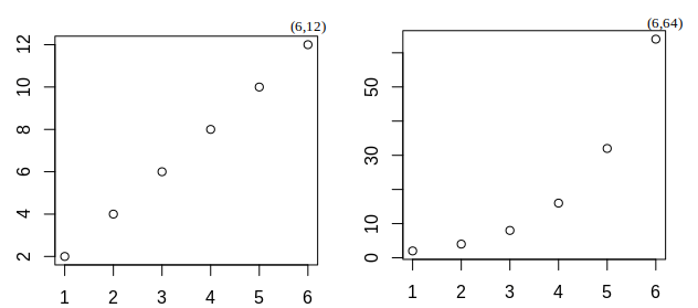 El gráfico de la izquierda muestra un crecimiento diario de 2 casos, por lo que en seis días se llega solo a 12 en total, pero el de la derecha es un gráfico exponencial de 2^x y en 6 días se llega a 64 casos. Por eso es tan importante que el crecimiento no sea exponencial. Para poner otro ejemplo, si la función para Covid-19 fuera 1,5^31 (31 son los días que tenemos con casos positivos), ya se habría alcanzado la suma de 287,627 y estaríamos a la caza del primer lugar, aunque para USA, aquí https://www.worldometers.info/coronavirus/, se reportan 348,042 casos (6 de marzo, 10:12 am).