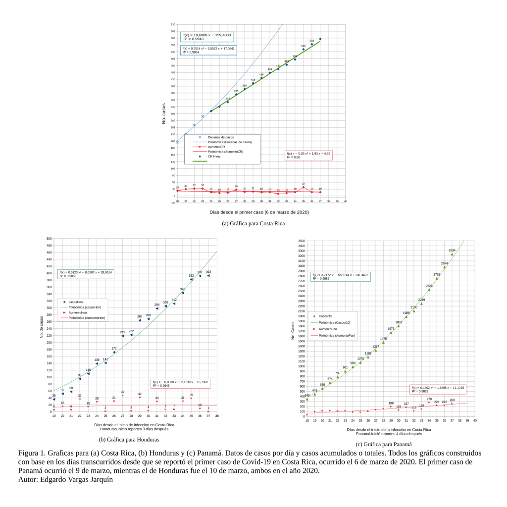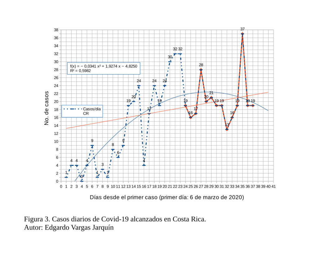 Las gráficas de la figura 3 las coloco más por ejercicio académico, pues ayudan a ilustrar lo que es el crecimiento diario y cómo va cambiando para Costa Rica. Los datos reales, como se observa, no muestran un verdadero patrón, pero forzándolos un poco calculé una función tipo y=cx^2 + bx + a, que, dibujada sobre los datos reales, describe una parábola (curva azul), siendo su máximo entre el día 27 y 28. Sería bueno que fuera la tendencia. Tendríamos motivos para alegrarnos, pues significaría que ya vamos bajando en la curva que todos esperábamos tener. Pero reitero, esto es solo un ejercicio académico, pues dicha curva no es lo que realmente nos pasa. Para entender nuestros datos de casos diarios es mejor dividir la curva y verla del día 1 al día 24, que fueron datos crecientes y luego verla del día 24 en adelante, donde se marca una línea recta creciente (en rojo), con una pendiente suave. Con esta recta podemos esperar de 19 a 22 casos para hoy.