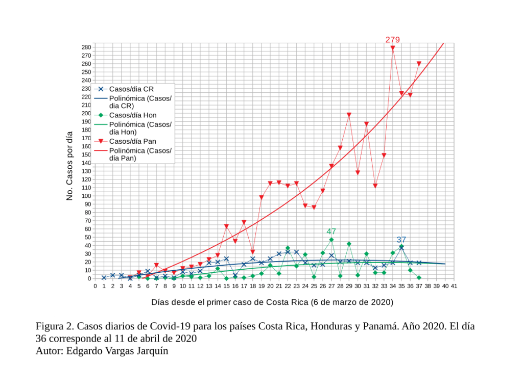 En la figura 2 se muestran los datos de casos diarios para los tres países (Costa Rica, Honduras y Panamá). Pero también se muestra lo mismo. No hay cambios. Sí llama la atención que en Honduras se diera un dato de crecimiento de un solo caso diario.