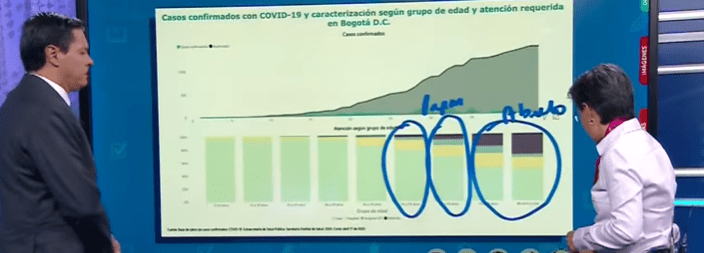 La Sra. Alcandesa marcó en azul cuatro columnas. A las primeras dos de la izquierda las nombró como papás y las dos últimas como abuelos. Habló de la estratégia de aislar a los abuelos y que los adultos saliera, pero indicó que los papás, que son parte de los adultos, se enfermaría y un porcentaje significativo moriría (color café oscuro). Pero además los adultos tenía que regresar a casa, luego de exponerse a ser contagiados y en la casa encontraría a sus hijos, pero también a los adultos mayores. Ella no apoya esa estrategia.