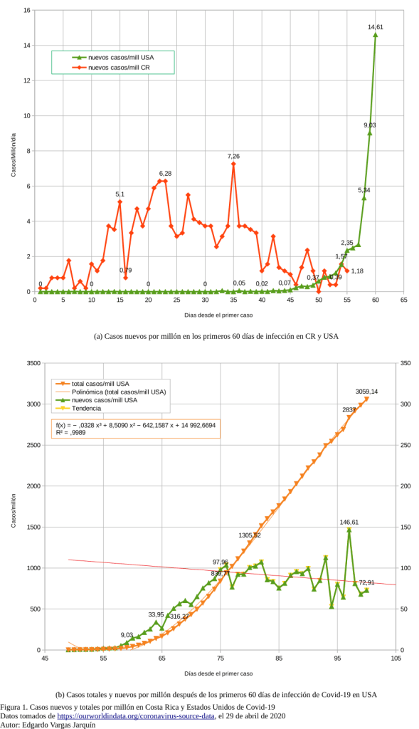 En esta sección del análisis sobre el Covid-19 estoy presentando, en la figura 1, dos imágenes. En la figura 1(a) se muestran dos gráficas que van del primer día al 60 desde el primer caso en Estados Unidos. Aunque ambas gráficas inician en días distintos las superpongo con el objeto de ver cómo se comportaron y para compararlas. Por eso y para que sea válido hacerlo, no se dan las fechas y los datos se transformaron a casos nuevos por cada millón de habitantes. Se advierte que para convertir los datos en casos reales pueden multiplicar los de CR por 5 y los de USA por 350, con lo que se obtiene una aproximación de lo real. Además indico que la serie de datos de CR tiene también el último dato de casos nuevos dado el día 30 de abril, que es 1,18 casos por millón, que equivale a 6 casos totales.