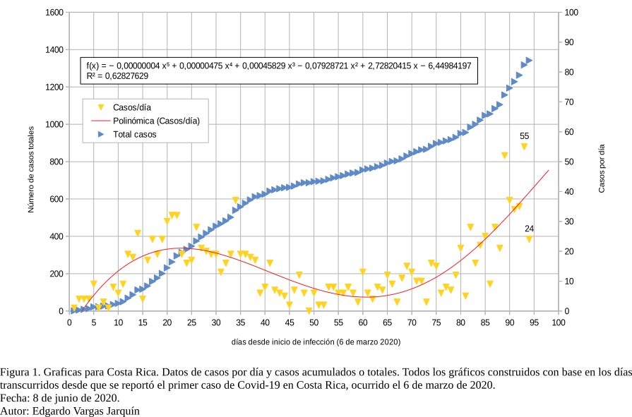 En la figura 1, luego de este párrafo, se muestran los casos totales desde el día 1 (6 de marzo de 2020) y hasta el día 94 de pandemia (8 de junio de 2020), datos que están graficados respecto al eje de la izquierda de la figura. También se presentan los datos de casos/día, los cuales obedecen al eje de la derecha.