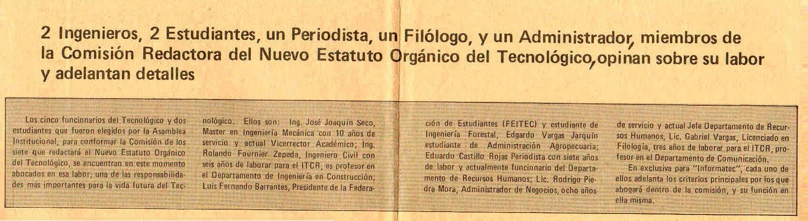 Durante 1980 y hasta 1982, inclusive, los estudiantes enfrentamos el problema más grave que sufría el TEC: su modelo organizativo y la carencia de democracia en la toma de decisiones. Este periodo finalizó con una gran gesta estudiantil y con la aprobación de un nuevo Estatuto Orgánico. Como líder estudiantil de ese periodo, participé en la redacción del Estatuto, con el fin de que incluyera a los estudiantes, a los administrativos y a los profesores, de manera democrática, en la toma de decisiones de esta universidad.